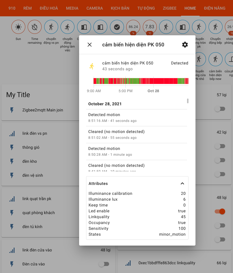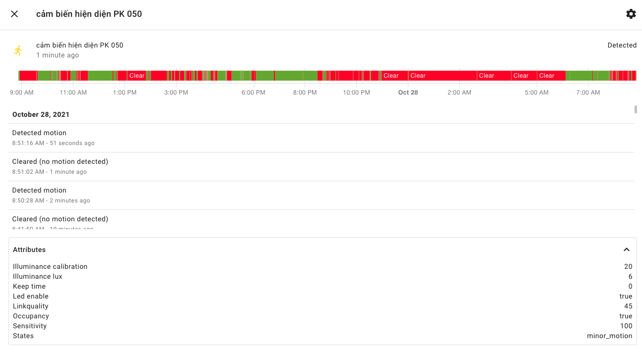 Các thông số của cảm biến hiện diện được hiển thị đầy đủ trên Home Assistant bao gồm thông số về trạng thái chuyển động, thông số cường độ ánh sáng, trạng thái đèn led của cảm biến, độ nhạy...